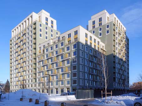 Это большой дом с разноуровневыми секциями, застройщик называет секции дома урбан-вилами, уточняя, что это дом-подъезд, рассчитанный на небольшое количество квартир. В проекте встречаются квартиры с террасами.