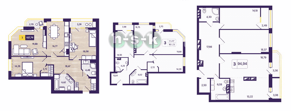 Планировки 2-комнатных квартир и студий 3-комнатные квартиры