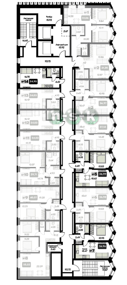 Блок А - типовой этаж (зеркально = блок В)