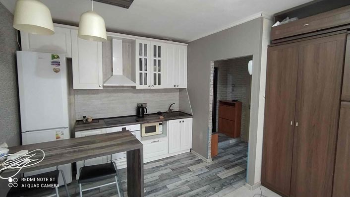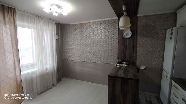 Удобная планировка: просторная застекленная лоджия (8м, дополнительно к указанной площади) на комнату и кухню. Кухонная зона перенесена в комнату, есть не большая спальня.
