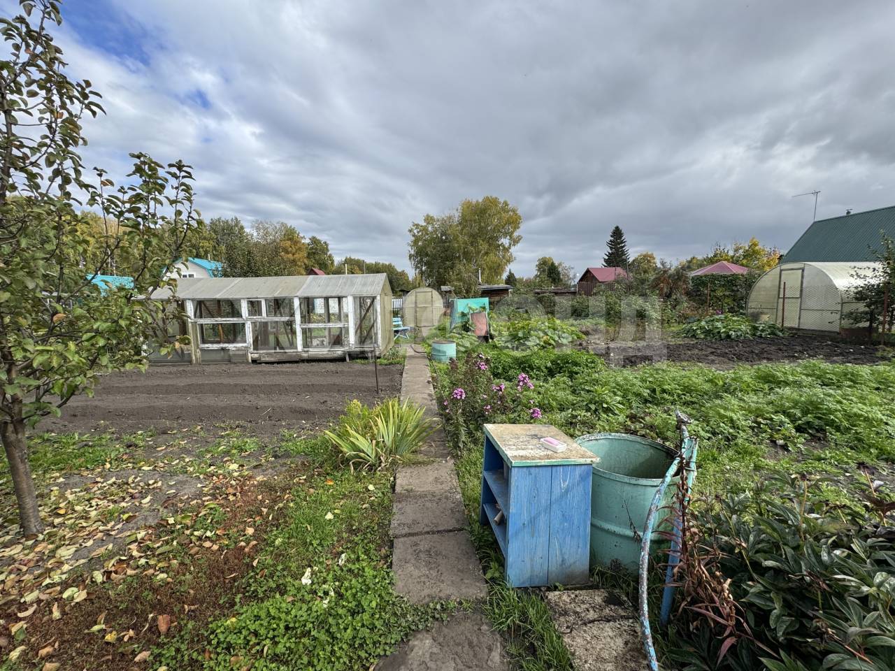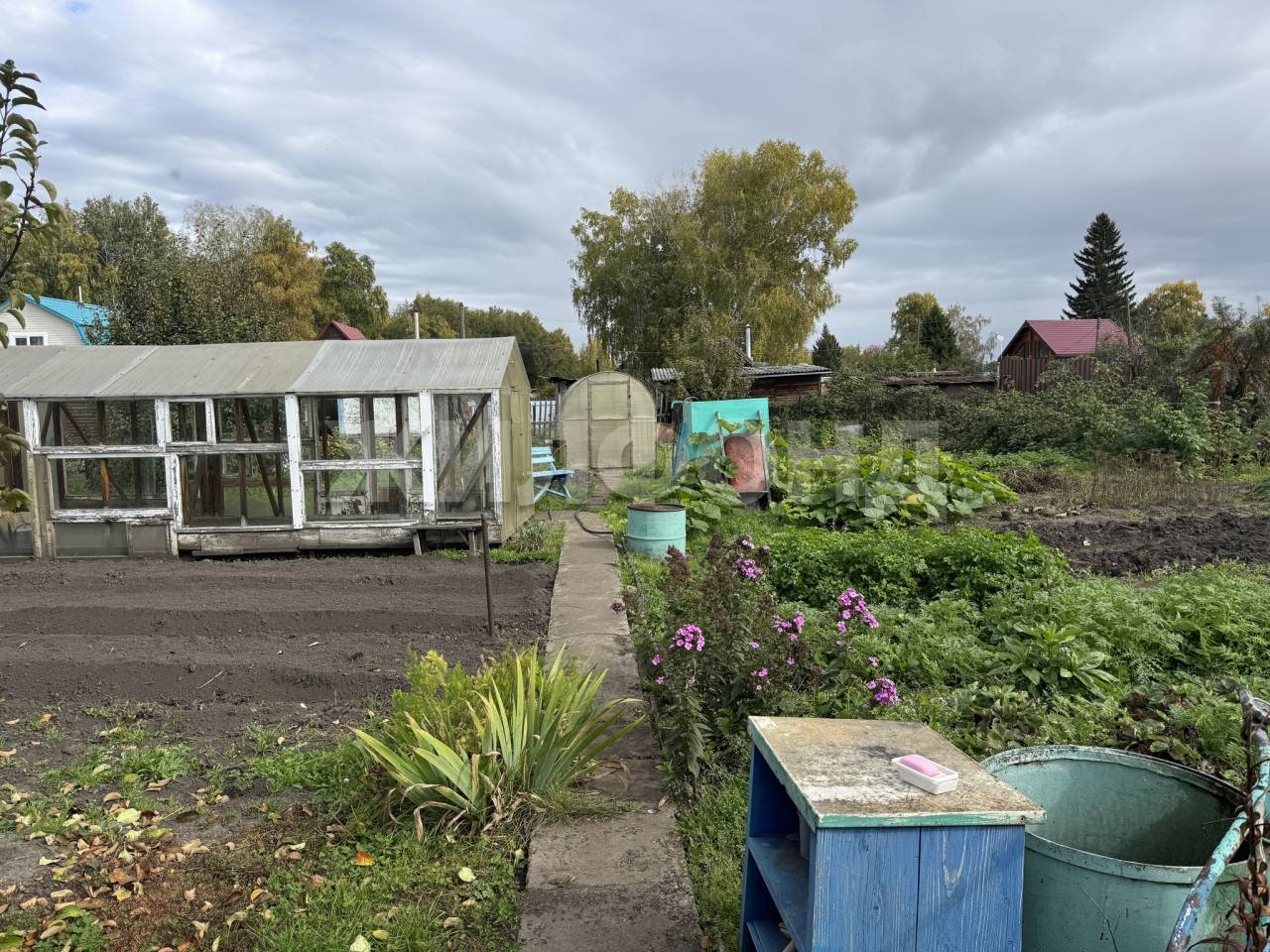 Ухоженный участок 6,8 соток со всеми посадками: 2 теплицы, яблони, облепиха, малина, ирга и др., многолетние цветы.